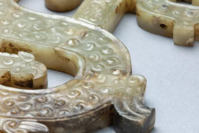 这枚青玉谷纹壁,其纹饰为成排密集小乳钉,呈旋涡状,传说是谷芽之像,寓风调雨顺,五谷丰登之意,故称谷纹。