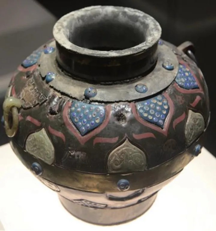 集金、银、铜、玉、水晶、料器于一身,造就了漆罐的华丽夺目。