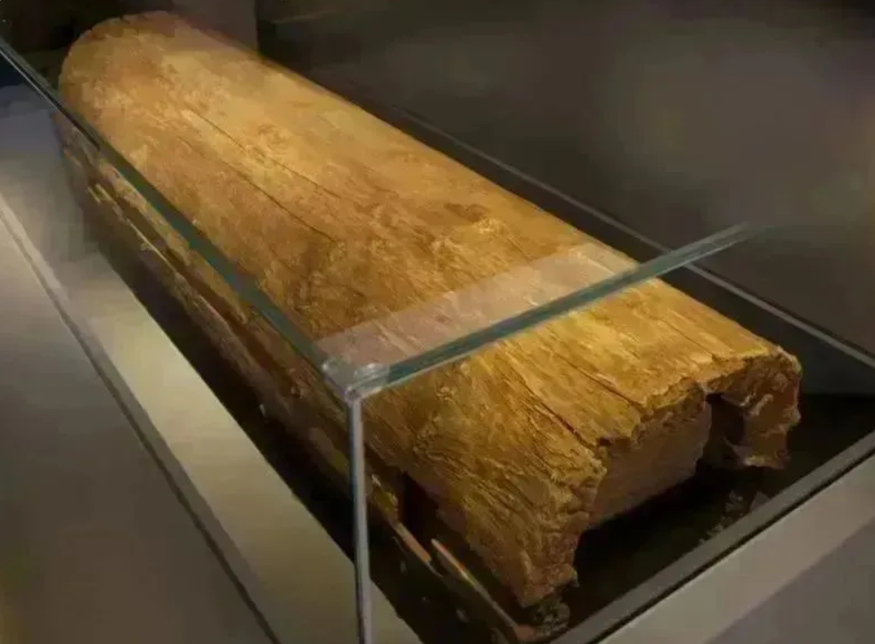 这座金丝楠木独木棺,长2.19米,直径为0.6米,是由一整根圆木制成,在灯光的照射下,还能够看到一缕缕的金丝,历经千年而幽香不减,保存得十分完整。