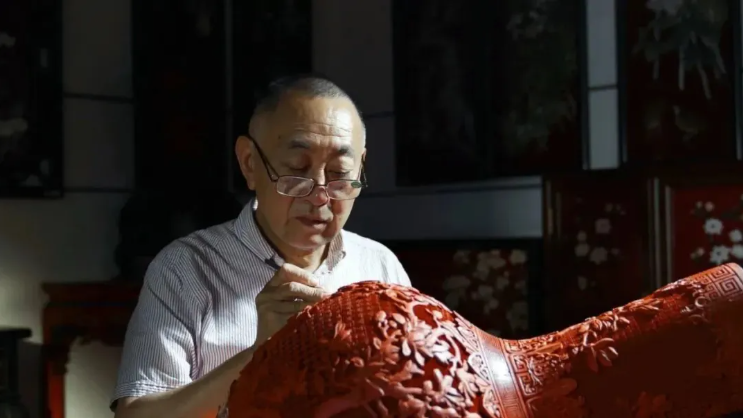 张来喜,雕漆工艺传承人,从事雕漆工作已有四十余年。