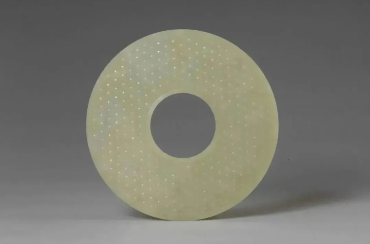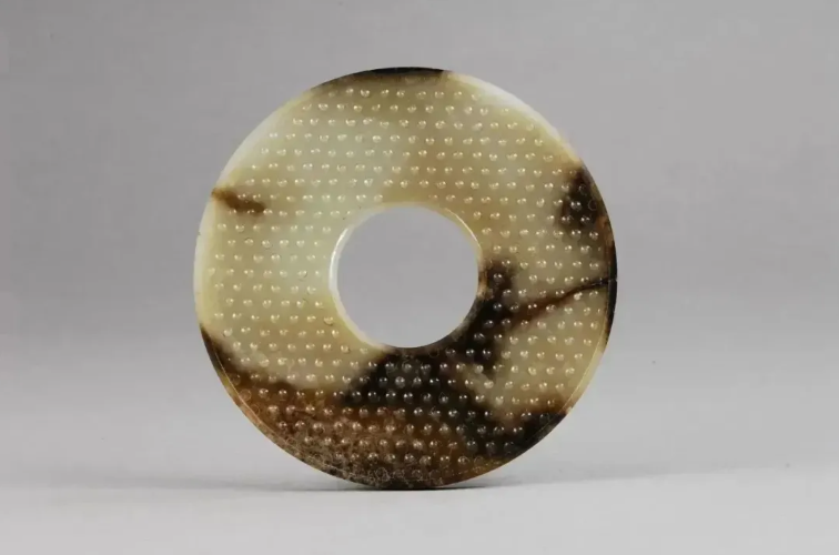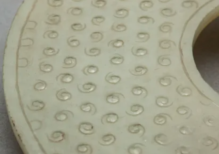 这枚青玉谷纹壁,其纹饰为成排密集小乳钉,呈旋涡状,传说是谷芽之像,寓风调雨顺,五谷丰登之意,故称谷纹。