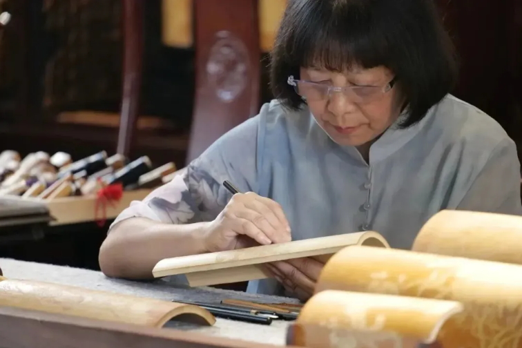 她继承爷爷赵德桢“留青”的雕刻手法,将阳刻与浅刻的结合,讲究简约雅致,随形施刻,依靠青皮与竹肌之间的明暗对比表达类似水墨晕染的效果。