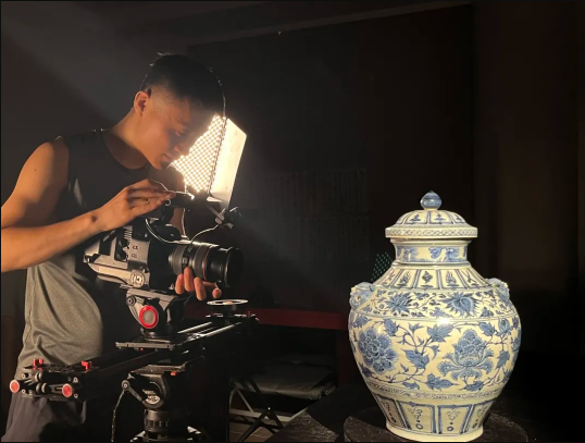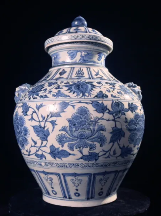 这件元青花缠枝牡丹纹兽耳盖罐,收藏在蚌埠市博物馆,色泽浓艳,格调高雅,是元青花瓷中的珍品。